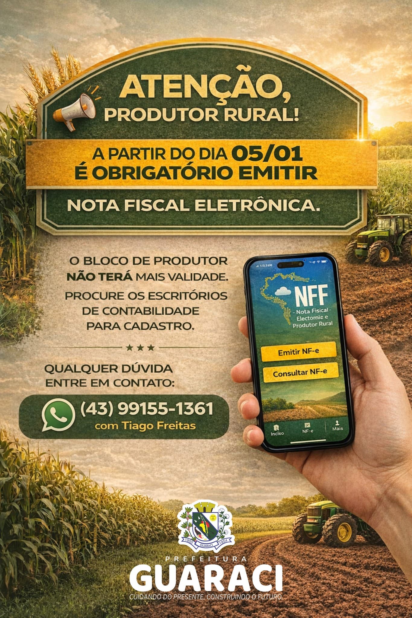 A partir do dia 05 de janeiro de 2026, passa a ser obrigatória a emissão da Nota Fiscal Eletrônica (NF-e). O bloco de produtor não terá mais validade.
