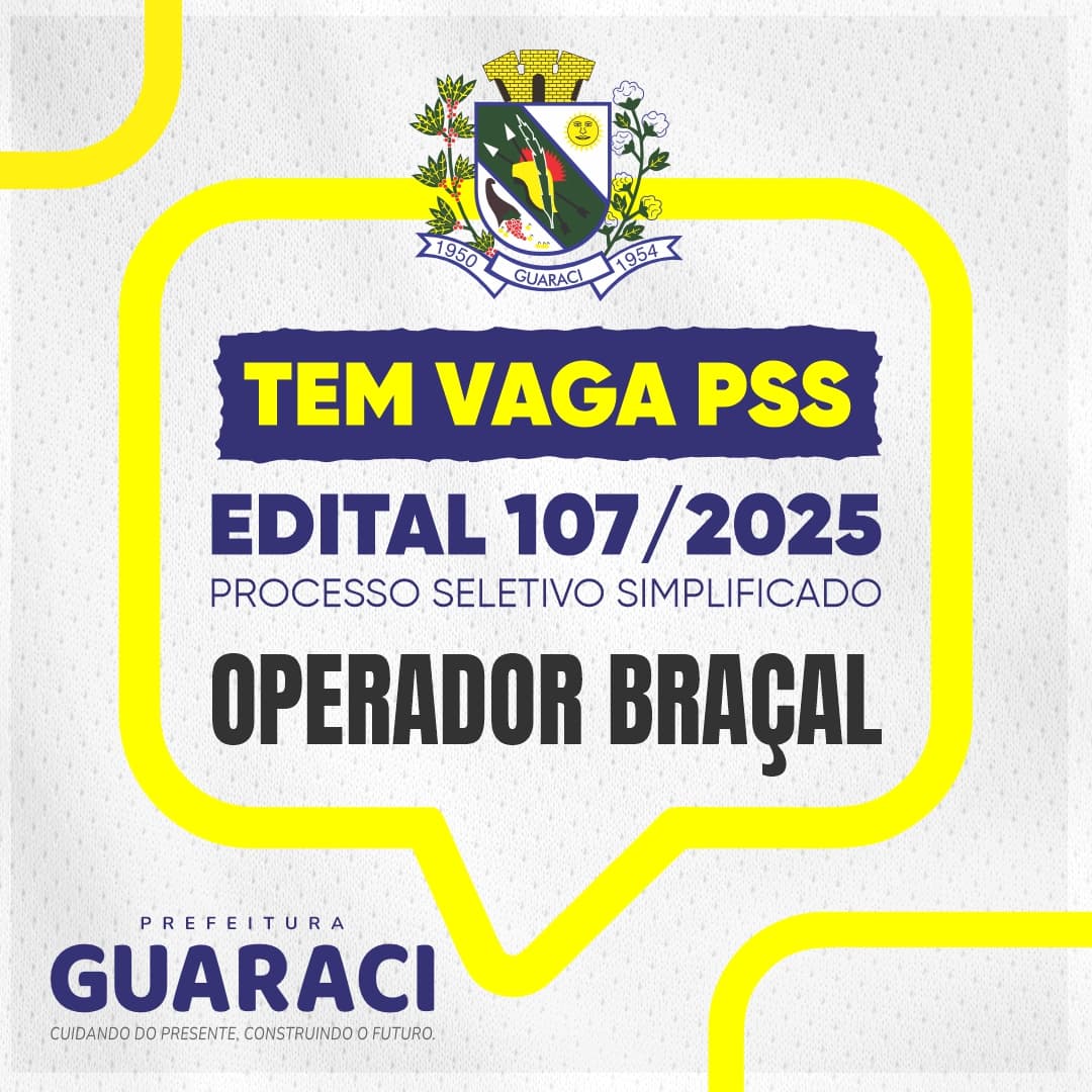 A Prefeitura de Guaraci informa que estão abertas as inscrições para o Processo Seletivo Simplificado destinado à contratação de Operário Braçal para atuar na Secretaria Municipal de Obras, Viação e Serviços Urbanos.