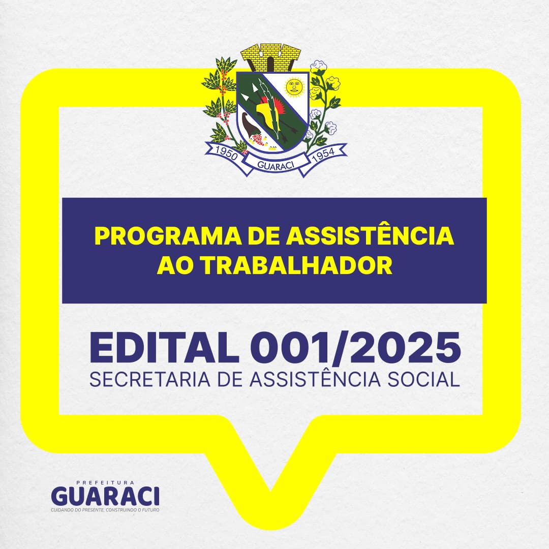 O Prefeito Municipal de Guaraci, Estado do Paraná, no uso de suas atribuições legais e tendo em vista a Lei Municipal nº 1852/2025, faz saber a todos os interessados que estão abertas as inscrições para o Programa de Assistência ao Trabalhador.