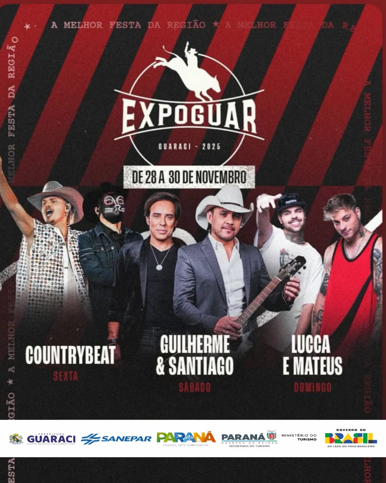 Vem aí a Expoguar 2025, confirmando porque é a melhor festa da região! Serão três dias inesquecíveis em Guaraci, de 28 a 30 de novembro, com muita emoção, rodeio e um lineup que vai fazer o chão tremer.