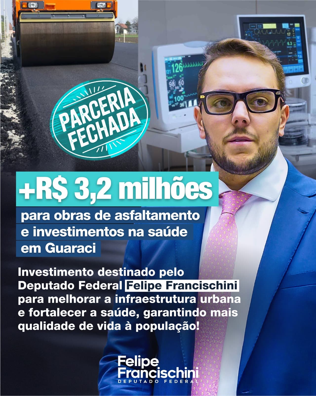 O município de Guaraci foi contemplado com a indicação de R$ 3,2 milhões em recursos viabilizados por meio da parceria com o Deputado Federal Felipe Francischini.
